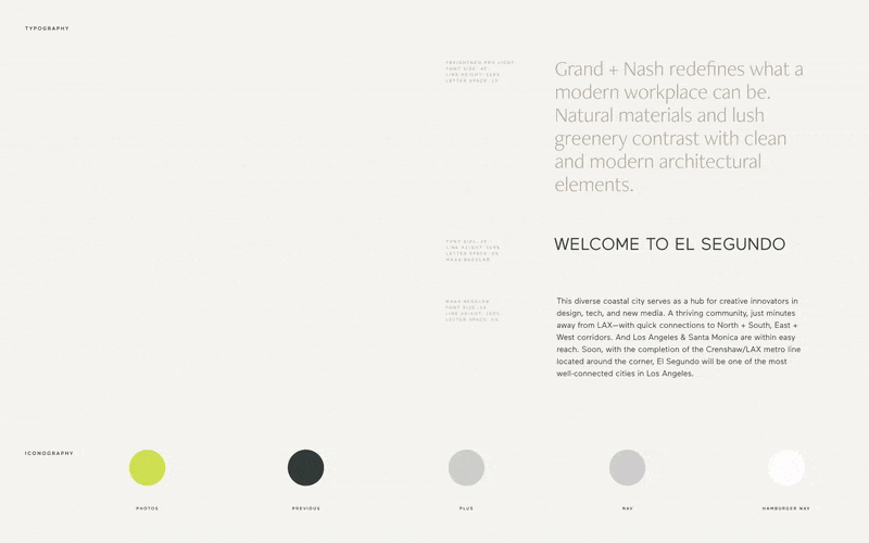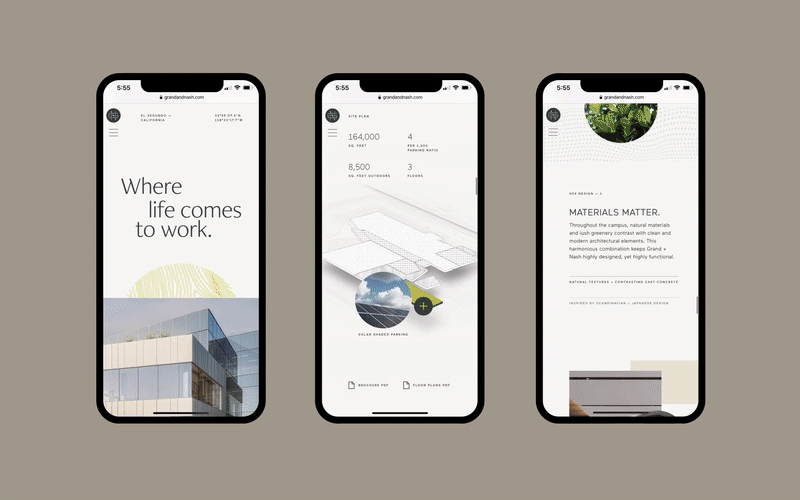 Our team led the strategy, branding, and web presence for commercial developer, Steelwave. The new property, Grand + Nash, is a newly renovated workplace that blends greenspace with the amenities of a future-forward office campus. While my colleagues worked on the visual language for the brand, I established tone and voice—from how amenities and material choices are described, to the site headlines, long copy, even UX/UI cues.