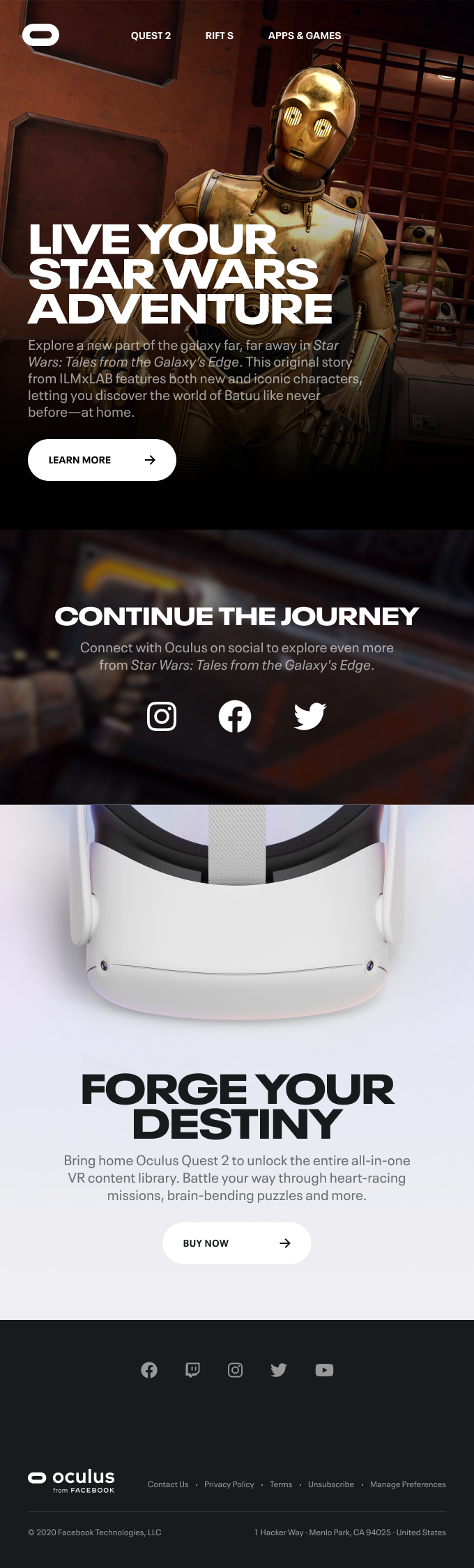 My team helped Meta Oculus scale & personalize CRM comms with hundreds of thousands of VR fans around the world. Using a test-and-learn approach, we embedded with our clients at HQ to write, design, develop & deploy CRM creative. Everything from the launch of Oculus Quest 2, to AAA title launches like Medal of Honor and Star Wars: Galaxy’s Edge. We constantly optimized, segmented and iterated our messaging to resonate with the passionate Oculus fandom.